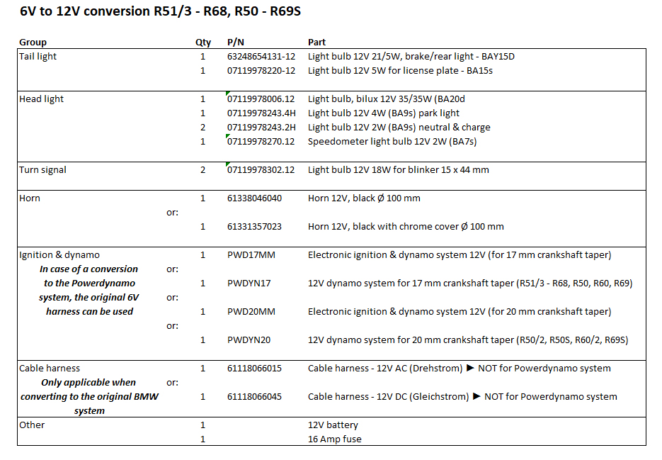 This list shows the part numbers for all parts that need to be changed in case of a conversion to 12V
